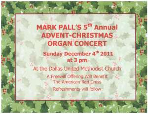 All are invited to attend an organ recital featuring a remarkable young talent. Mark Pall, a freshman at Dallas High School and a member of the Pennsylvania Northeast AGO Chapter, will present a concert of Advent and Christmas music on Sunday, December 4 at 3:00 p.m. at Dallas United Methodist Church. Mark studies organ with chapter secretary Ed Loch. Those who attend this program are sure to be impressed by Mark’s talent of playing by ear.