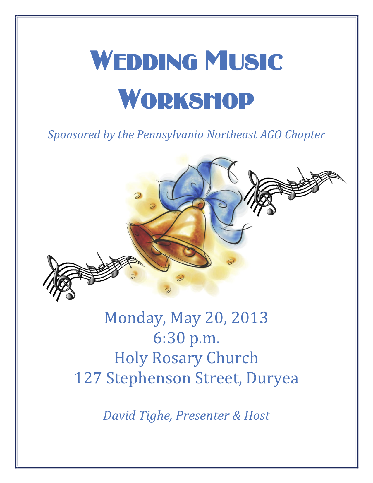 Please mark your calendar for our chapter’s next event, a Wedding Music Workshop led by chapter member David Tighe, on Monday, May 20 at 6:30 p.m. at Holy Rosary Church, 127 Stephenson Street in Duryea.