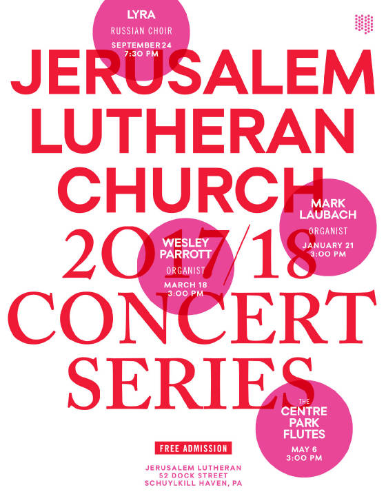 Canon Mark Laubach will be giving a recital at Jerusalem Evangelical Lutheran Church, 252 Dock Street, Schuylkill Haven, on Sunday, January 21 at 3:00 p.m. The recital will feature works by Bach, Brahms, Manz, Searle Wright, Otto Nicolai (transcribed by Liszt), Mendelssohn, Gigout, Stephen Paulus, and Vierne performed on the church’s beautifully voiced 1995 Schantz pipe organ. Please spread the word about this fantastic performance!