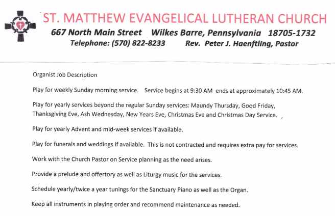 St. Matthew Evangelical Lutheran Church in Wilkes-Barre is currently searching for an organist to accompany services on the church’s pipe organ. A job description is included below. If you are interested or have any questions about the position, please contact Bob Novak at bob.novak@verizon.net or call 570-762-3662.