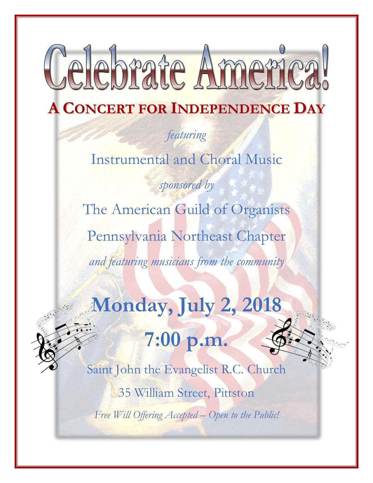 Members of the Pennsylvania Northeast Chapter of the American Guild of Organists are planning a concert of patriotic music entitled “Celebrate America!” on Monday, July 2 at 7:00 p.m. at St. John the Evangelist Church in Pittston. Chapter members are hoping to form a combined choir which will sing the National Anthem and patriotic hymns during the concert. The choir will be under the direction of Raphael Micca, Dean, and accompanied by organist Michael Sowa, music director at Our Lady of the Eucharist Parish. Anyone who loves to sing is invited to take part in this concert! Rehearsals will be held at Saint John’s on Monday, June 18 and Monday, June 25 at 7:00 p.m. If you are interested in singing, please e-mail Mike Sowa at msowa126@gmail.com, or call him at 570-881-2301 by Monday, June 4.