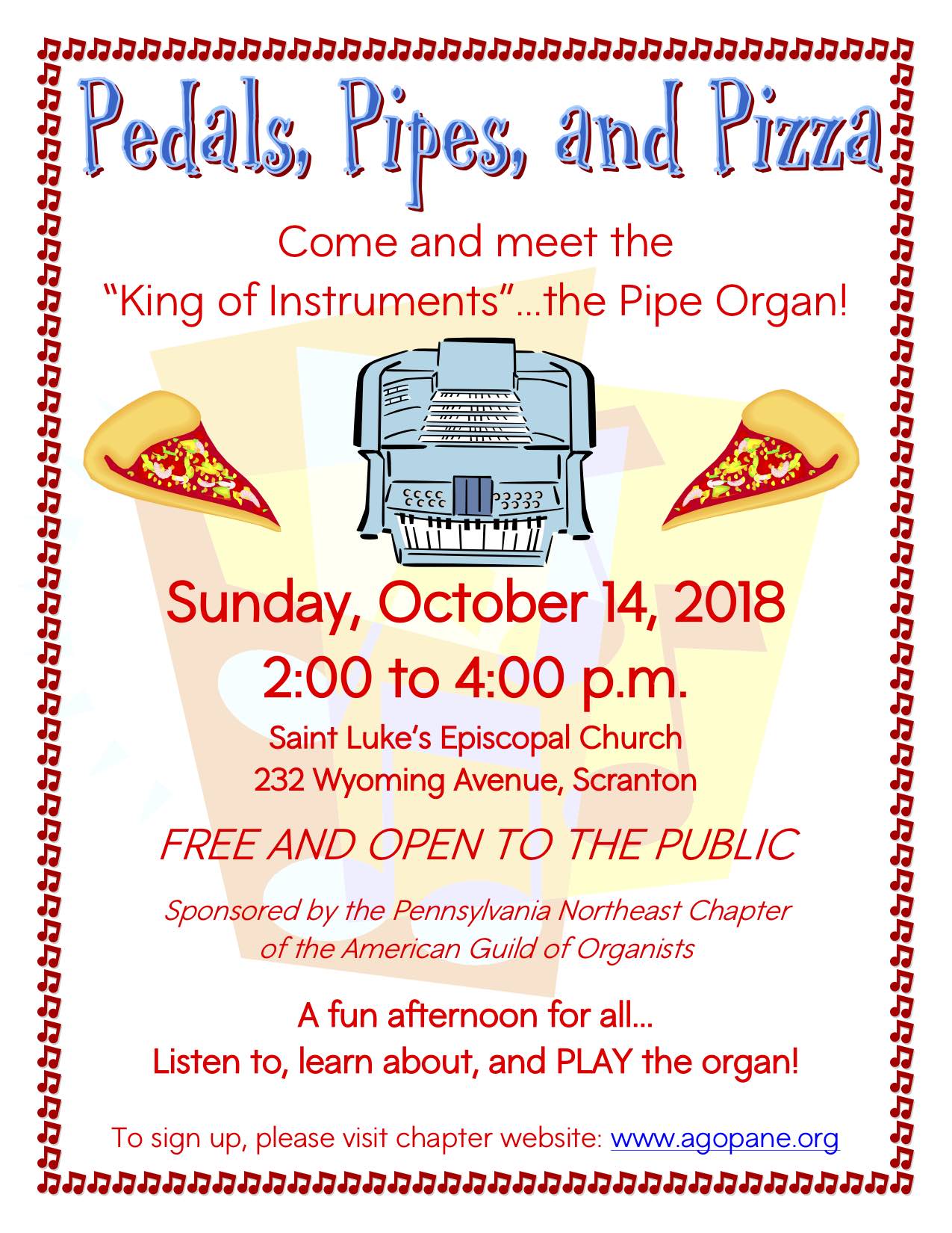 Join us on Sunday, October 14 at St. Luke’s Episcopal Church, Scranton from 2:00 to 4:00 p.m. for Pedals, Pipes, and Pizza. Participants will receive a behind the scenes tour of the instrument in addition to a chance to play it themselves (and eat some pizza!). All are welcome to attend. Students currently studying the piano are encouraged to bring a piece to play on the organ.