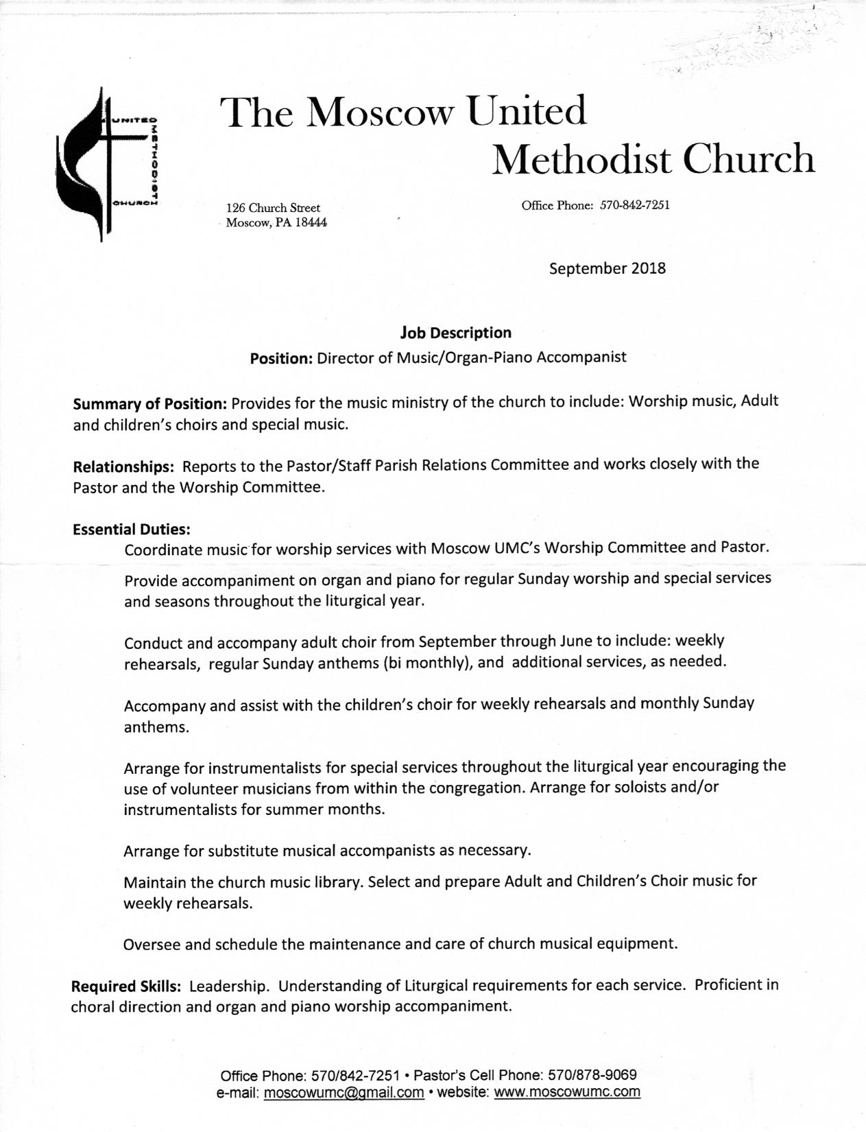 Moscow United Methodist Church is seeking a Director of Music/Organ- Piano Accompanist. Please see the job description below. Contact the church office at moscowumc@gmail.com or call 570-842-7251 for more information or to apply.