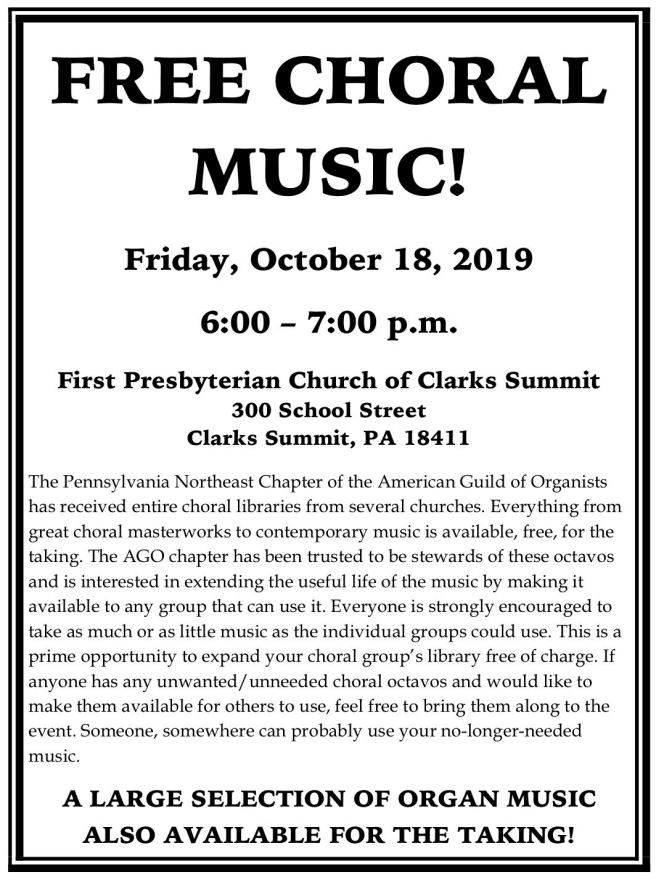 The Pennsylvania Northeast Chapter of the American Guild of Organists has received entire choral libraries from several churches. Everything from great choral masterworks to contemporary music is available, free, for the taking. The AGO chapter has been trusted to be stewards of these octavos and is interested in extending the useful life of the music by making it available to any group that can use it.