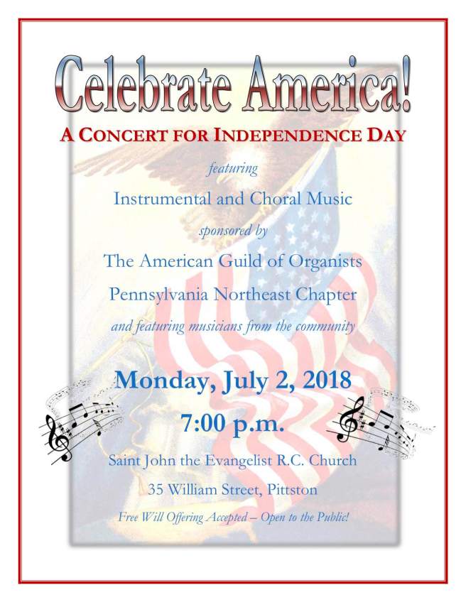 Join us for a concert of American music at St. John’s Church in downtown Pittston on Monday, July 2 at 7:00 p.m.. Members of the Pennsylvania Northeast Chapter of the American Guild of Organists will perform selections on the church’s pipe organ accompanied by a brass quartet and a community choir. Admission is free and the event is open to the public.